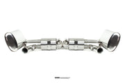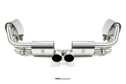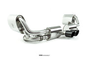 Starting at the manifolds, replacing the stock cats for our 100 cell, or long tube catless Inconel headers opens up the sound significantly. The gases are then passed through one of 2 channels. On valve closed, the gases pass through our harmonically tuned, and internally ceramic insulated wing silencers to remove unwanted drone during highway cruising, and into the center muffler, and finally our trademark 1D CLR x pipe, this setup keeps the car very civilised when you want it to be.